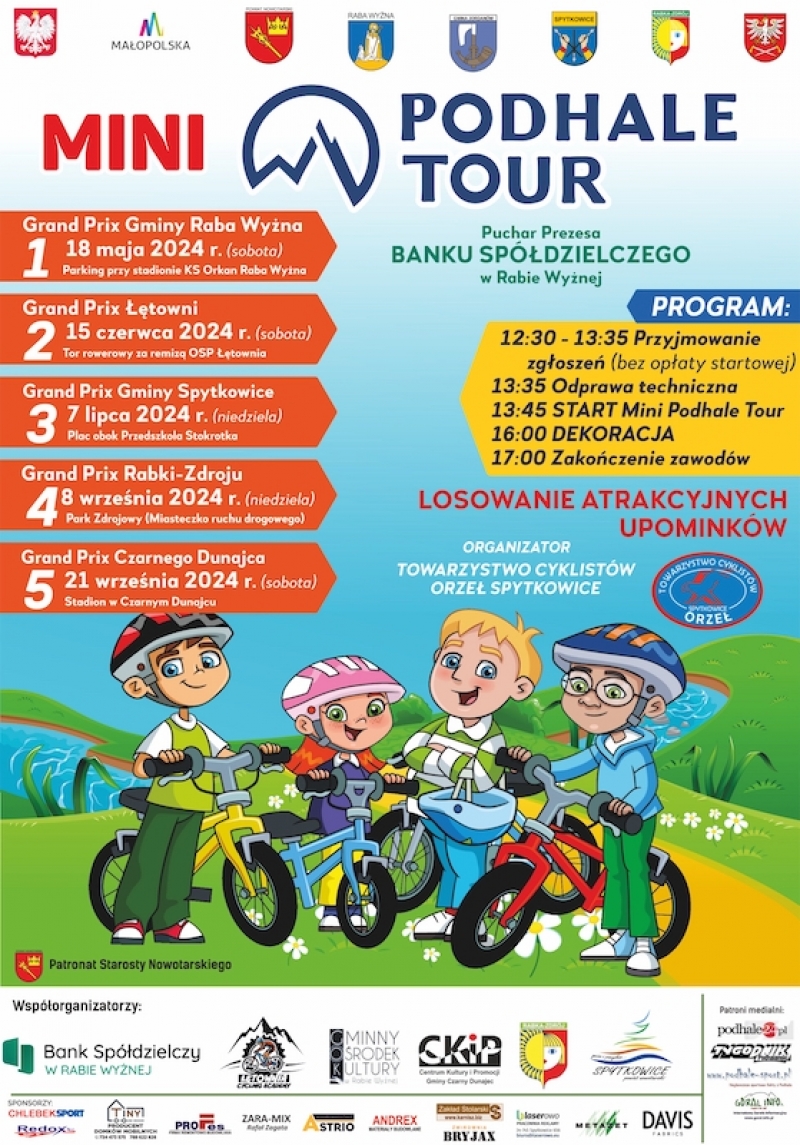 Organizatorem Mini Podhale Tour jest Towarzystwo Cyklistów Orzeł Spytkowice a zawody współfinansują gminy na terenie których rozgrywane są zawody, Bank Spółdzielczy w Rabie Wyżnej, ŁĘTOWNIA CYCLING ACADEMY oraz inni sponsorzy a patronat Honorowy sprawuje Starosta Nowotarski.