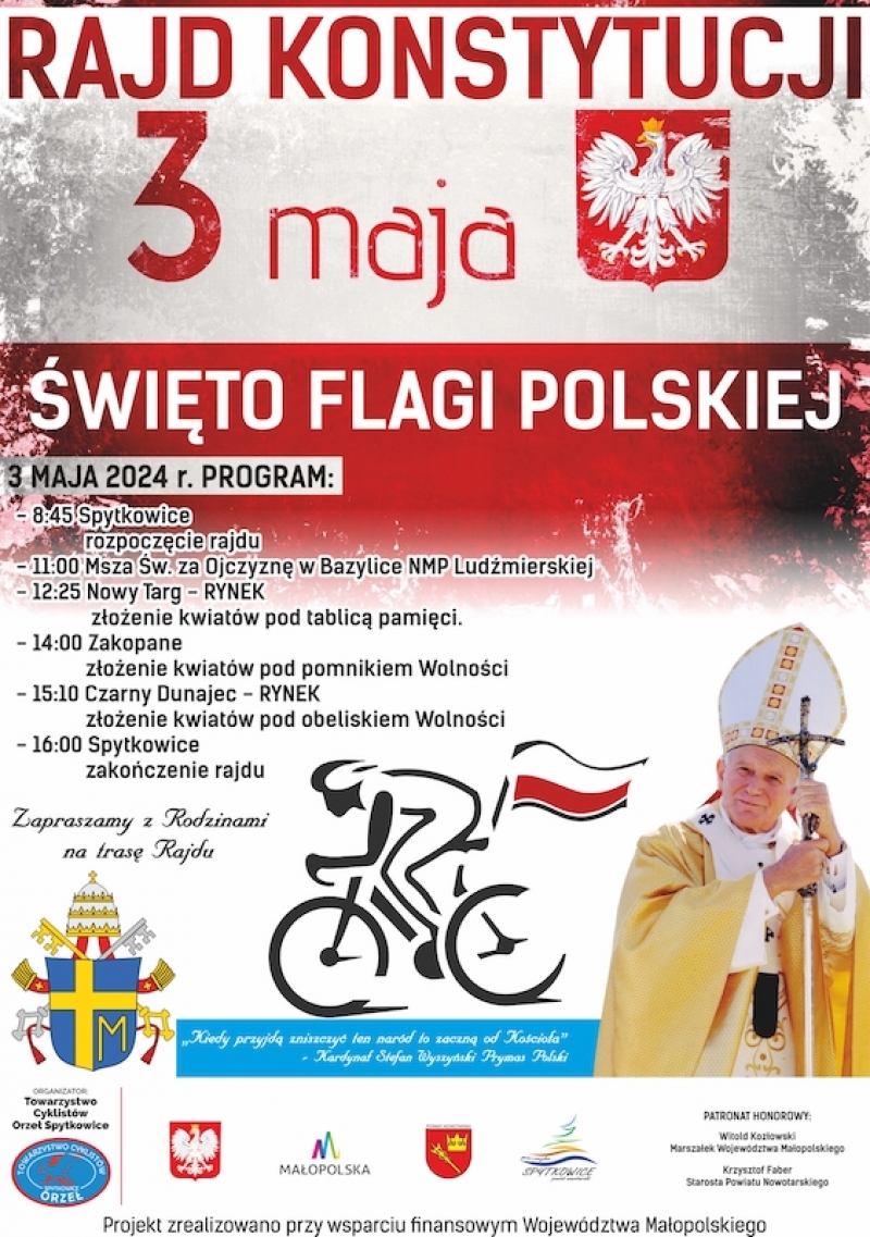 Dzień 3 maja w pamięci Polaków stanowi wyjątkową datę, która upamiętnia ogłoszenie w 1791 roku, pierwszej w Europie, a drugiej na świecie ustawy zasadniczej - zwanej Konstytucją 3 Maja. Najwięksi myśliciele i intelektualiści okresu Oświecenia uznawali Ją za „wielki przełom” i opisywali jako „najszlachetniejsze dobro otrzymane kiedykolwiek przez jakikolwiek naród”. Świętowanie Konstytucji 3 Maja było zakazane przez zaborców jak i okupantów. Naród Polski nigdy nie poddał się obcym, pielęgnował i zachował swą tożsamość i miłość do Ojczyzny, która została doskonale wyrażona w symbolach narodowych. Symbole te będące pomnikiem martyrologii, ukazują nam szeroki obraz walk, upadków i zwycięstw Narodu Polskiego. Narodu, który nigdy nie wszczynał agresywnych działań a który ciągle musiał składać krwawą ofiarę w obronie swej Ojczyzny. Również dzisiaj wrogie siły przypuszczają haniebny atak na nasze święte narodowe wartości, na naszych Bohaterów, na Polskę! Ciągle aktualne są słowa wypowiedziane przez Prymasa Tysiąclecia, Kardynała Stefana Wyszyńskiego: „Kiedy przyjdą zniszczyć ten naród, zaczną od Kościoła”. Dlatego ten Patriotyczny Rajd Rowerowy jest wyrażeniem gorącej miłości do Ojczyzny, a jednocześnie ostrym sprzeciwem wobec wrogich i nienawistnych ataków uderzających w naród Polski, religię katolicką i naszą tożsamość - czytamy w komunikacie przesłanym przez organizatora.